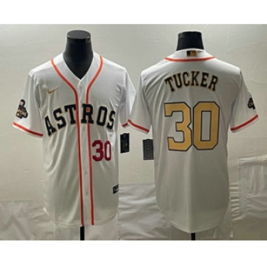 Men's Houston Astros #30 Kyle Tucker Number 2023 White Gold World Serise Champions Cool Base Stitched Jerseys