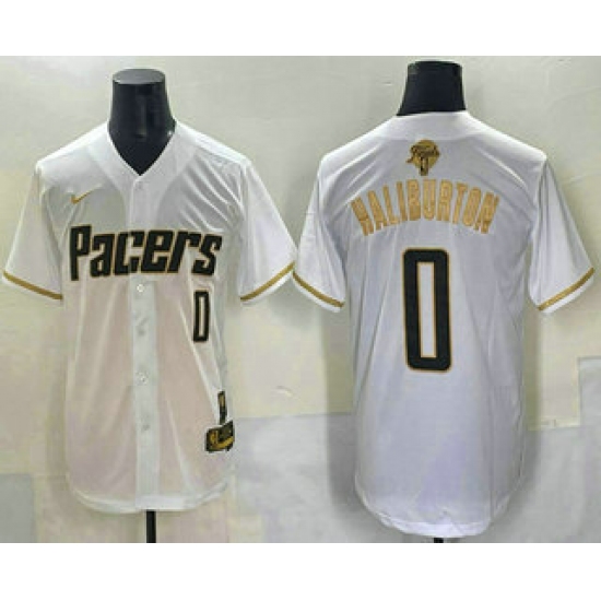 Men's Indiana Pacers #0 Tyrese Haliburton White Gold 2025 Finals Vapor Stitched Baseball Jersey