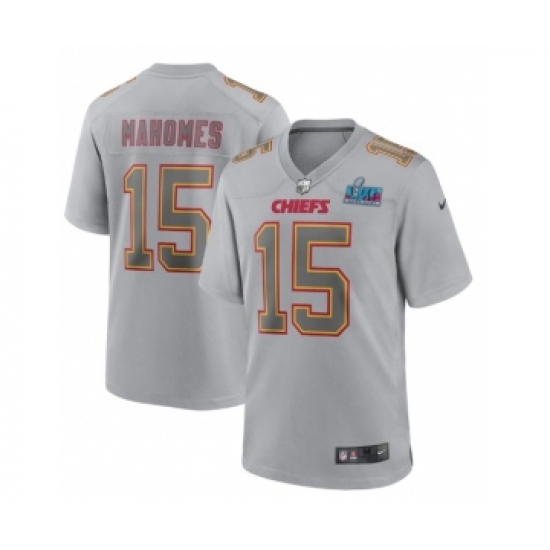 >Men's Kansas City Chiefs #15 Patrick Mahomes Gray Super Bowl LVII Patch Atmosphere Fashion Stitched Game Jersey
