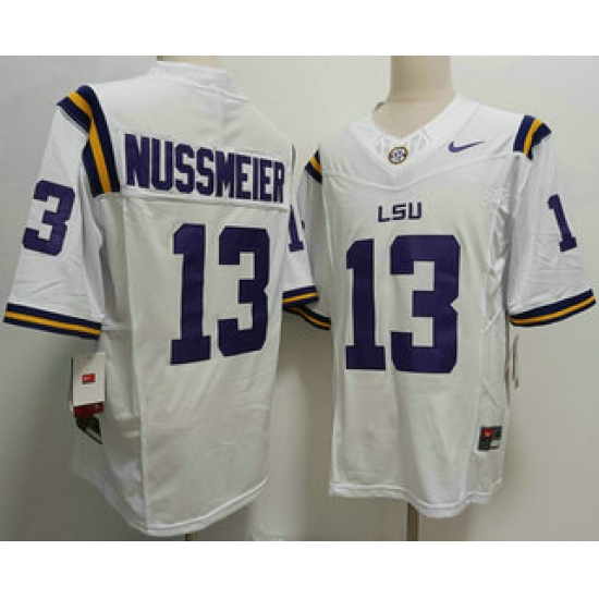 >Men's LSU Tigers #13 Garrett Nussmeier White FUSE College Stitched Jersey