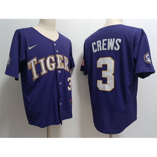 >Men's LSU Tigers #3 ylan Crews Purple 2023 Stitched Baseball Jersey