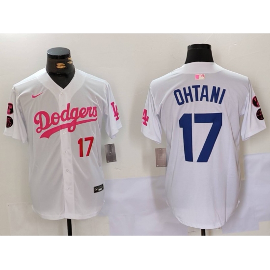 >Men's Los Angeles Dodgers #17 Shohei Ohtani White Pink Vin & Kobe Stitched Baseball Jerseys