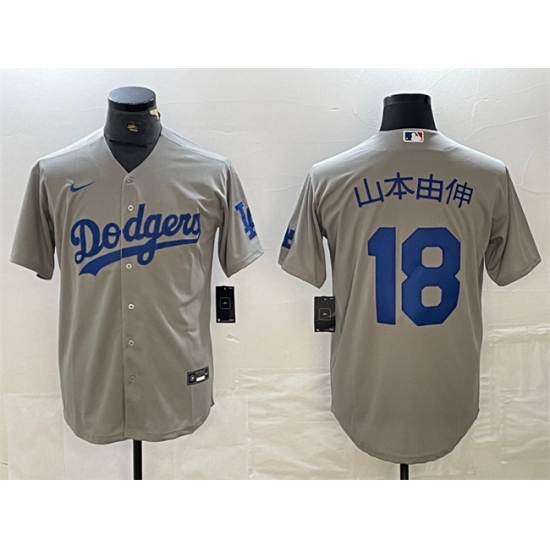 >Men's Los Angeles Dodgers #18 山本由伸 Gray Cool Base With Patch Stitched Baseball Jersey