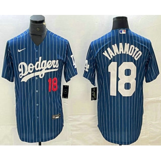 Men's Los Angeles Dodgers #18 Yoshinobu Yamamoto Number Blue Pinstripe Cool Base Stitched Baseball Jersey1