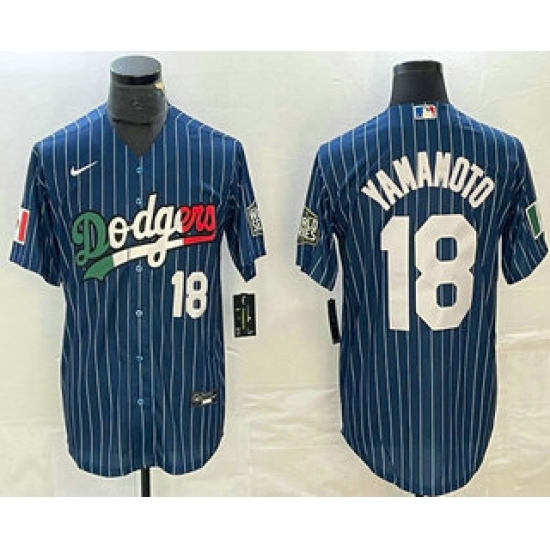 >Men's Los Angeles Dodgers #18 Yoshinobu Yamamoto Number Navy Blue Pinstripe Mexico 2020 World Series Cool Base Nike Jersey