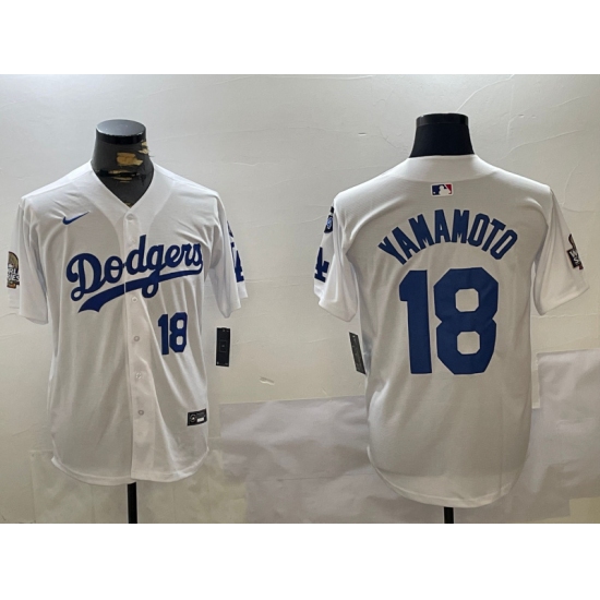 >Mens Los Angeles Dodgers #18 Yoshinobu Yamamoto White 2024 World Series With Fernando Memorial Home Limited Stitched Baseball Jersey