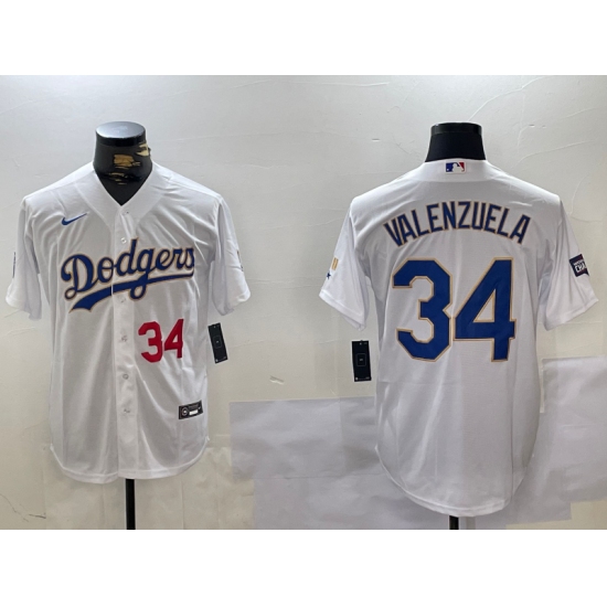 Men's Los Angeles Dodgers #34 Fernando Valenzuela Number White Gold Championship Stitched Cool Base Nike Jersey