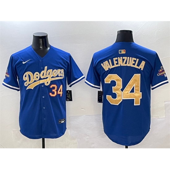 >Men's Los Angeles Dodgers #34 Fernando Valenzuela Royal 2025 Gold Collection Limited Stitched Baseball Jersey