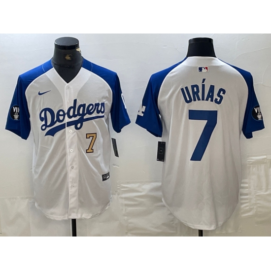 Mens Los Angeles Dodgers #7 Julio Urias Number White Blue Fashion Stitched Cool Base Limited Jersey