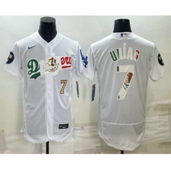 Mens Los Angeles Dodgers #7 Julio Urias Number White With Vin Scully Flex Base Stitched Baseball Jersey