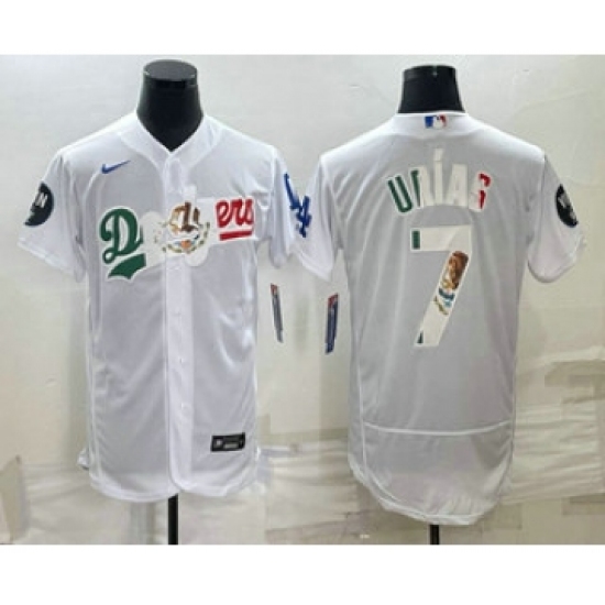 >Men's Los Angeles Dodgers #7 Julio Urias White With Vin Scully Flex Base Stitched Baseball Jerseys