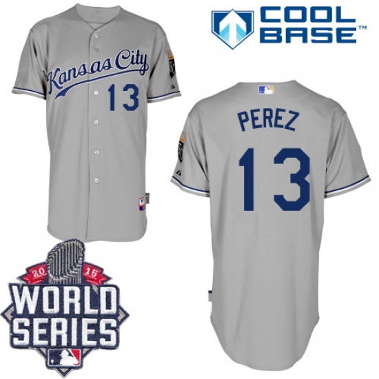 Home>MLB>Kansas City Royals>Salvador Perez>Men's Majestic Kansas City Royals #13 Salvador Perez Authentic Grey Road Cool Base 2015 World Series