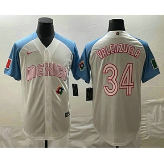 >Men's Mexico Baseball #34 Fernando Valenzuela 2023 White Blue World Classic Stitched Jersey