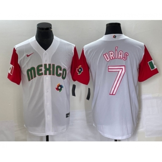 >Men's Mexico Baseball #7 Julio Urias Number 2023 White Red World Classic Stitched Jersey 47