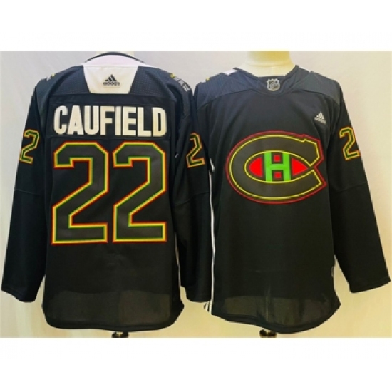 >Men's Montreal Canadiens #22 Cole Caufield 2022 Black Warm Up History Night Stitched Jersey