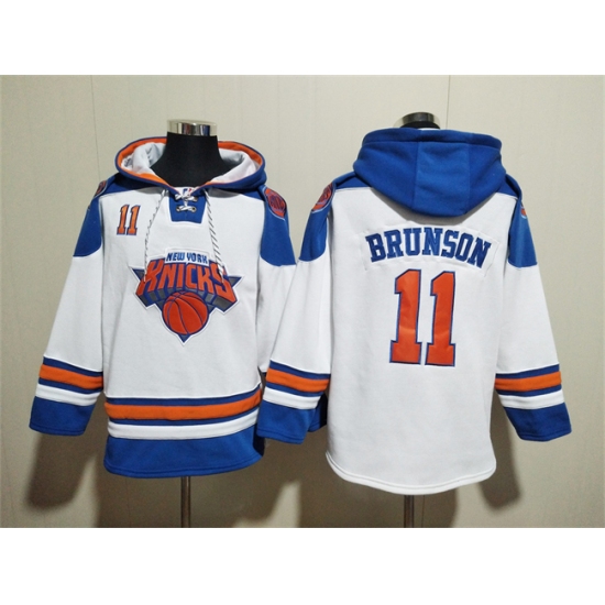 >Men's New Yok Knicks #11 Jalen Brunson White Lace-Up Pullover Hoodie
