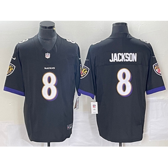 >Men's Nike Baltimore Ravens #8 Lamar Jackson Purple 2023 F.U.S.E Coloe Rush Jersey