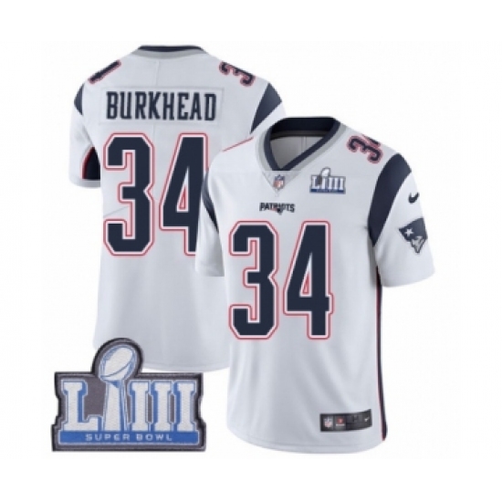 >Men's Nike New England Patriots #34 Rex Burkhead White Vapor Untouchable Limited Player Super Bowl LIII Bound NFL Jersey
