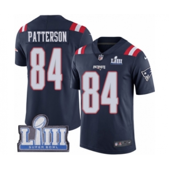 >Men's Nike New England Patriots #84 Cordarrelle Patterson Limited Navy Blue Rush Vapor Untouchable Super Bowl LIII Bound NFL Jersey