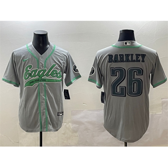 >Men's Philadelphia Eagles #26 Saquon Barkley Gray Cool Base Stitched Baseball Jersey