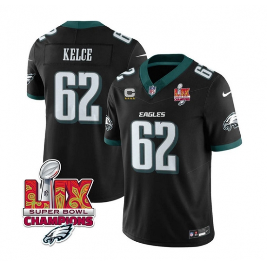 >Men's Philadelphia Eagles #62 Jason Kelce Black 2025 Eagles Logo Super Bowl LIX And 4-Star C New F.U.S.E. Vapor Limited Football Stitched Jersey
