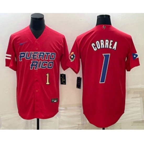 >Men's Puerto Rico Baseball #1 Carlos Correa Number 2023 Red World Baseball Classic Stitched Jerseys