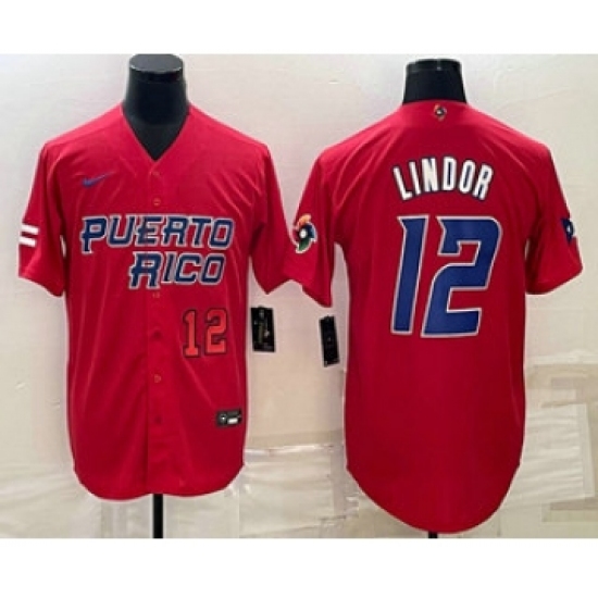 Mens Puerto Rico Baseball #12 Francisco Lindor Number 2023 Red World Baseball Classic Stitched Jersey