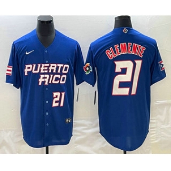 Men's Puerto Rico Baseball #21 Roberto Clemente Number 2023 Blue World Classic Stitched Jerseys