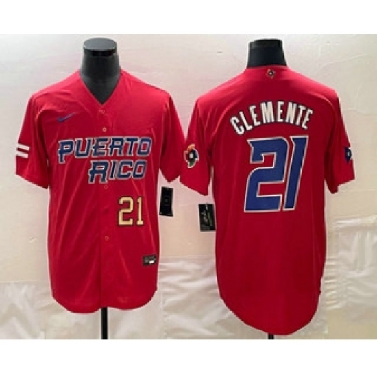 >Mens Puerto Rico Baseball #21 Roberto Clemente Number 2023 Red World Classic Stitched Jersey