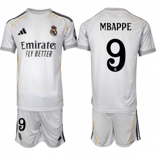 Men's Real Madrid #9 Kylian Mbappe 25-26 White Home Soccer Jersey Suit