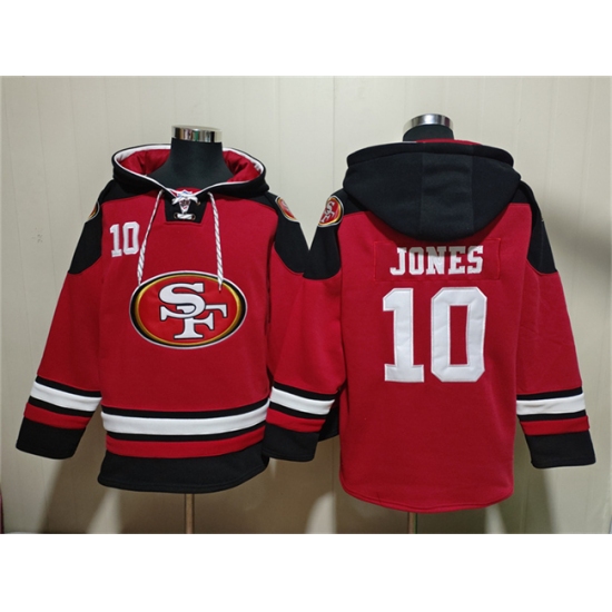 >Men's San Francisco 49ers #10 Mac Jones Red Black Ageless Must-Have Lace-Up Pullover Hoodie