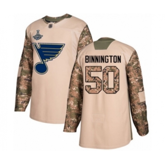 >Men's St. Louis Blues #50 Jordan Binnington Authentic Camo Veterans Day Practice 2019 Stanley Cup Champions Hockey Jersey