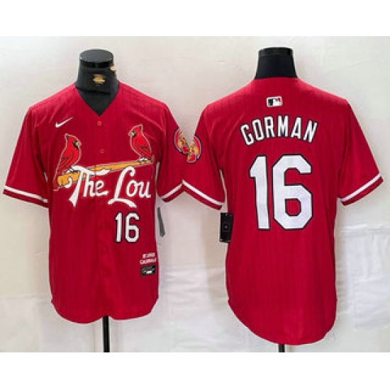 >Men's St Louis Cardinals #16 Nolan Gorman Red 2024 City Connect Stitched Baseball Jersey