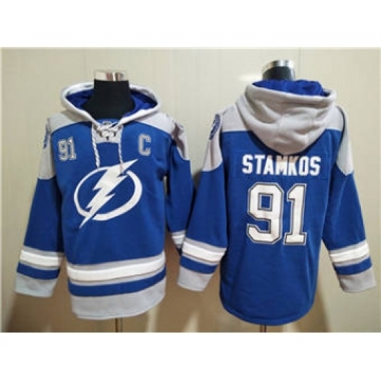 >Men's Tampa Bay Lightning #91 Steven Stamkos Blue Ageless Must-Have Lace-Up Pullover Hockey Hoodie