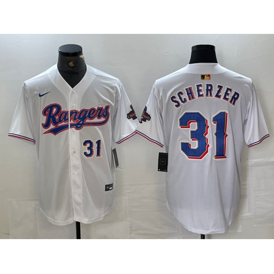 Men's Texas Rangers #31 Max Scherzer Number White 2023 World Series Champions Cool Base Jerseys