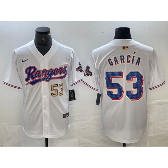 >Men's Texas Rangers #53 Adolis Garcia Number White 2023 World Series Champions Cool Base Jerseys