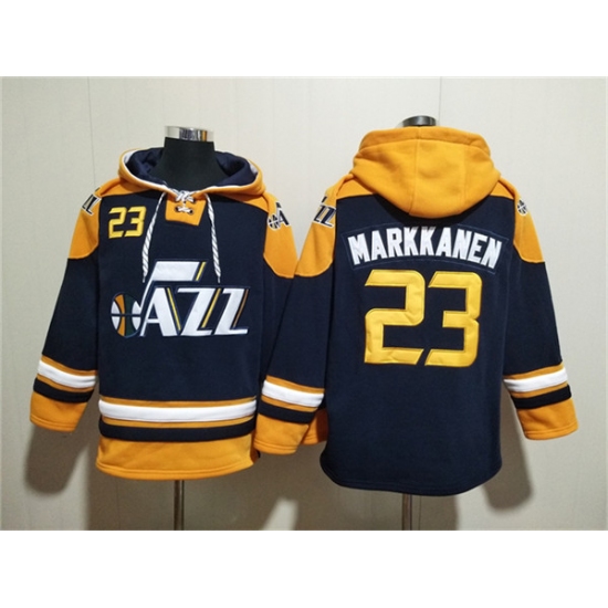 >Men's Utah Jazz #23 Lauri Markkanen Navy Yellow Lace-Up Pullover Hoodie