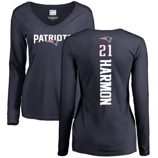 NFL Women's Nike New England Patriots #21 Duron Harmon Navy Blue Backer Slim Fit Long Sleeve T-Shirt