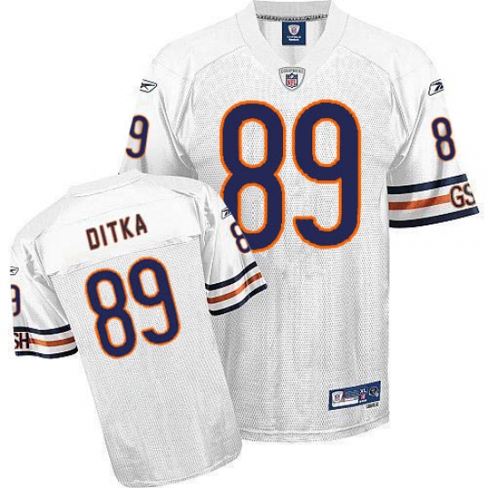 Feel like part of your favorite team by wearing this NFL® Reebok Chicago Bears #89 Mike Ditka Authentic Jersey White Authentic Throwback NFL Jersey, made of thick, high-quality Pro-Brite fabric for a genuine gridiron look. The players number which 100% stitched is displayed in tackle twill on the chest, back and sleeves, along with the team name on the front. The players name which 100% stitched is displayed on a sewn-down nameplate at the back. 100% Pro-Brite nylon and 100% Pro-Brite polyester for body, 100% lycratalic spandex dazzle for Side Panels/Collar/Cuffs, NFL® Equipment patch sewn on the bottom of the front collar or fabric insert, NFL® Equipment jock tag with numeric sizing is applied to the lower left bottom of the jersey, Officially licensed