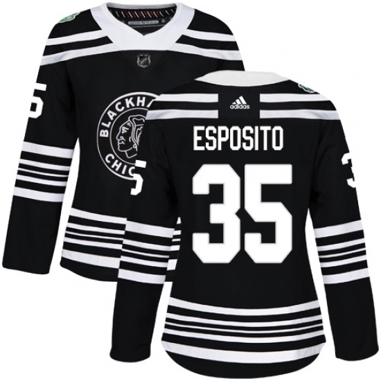 >Women's Adidas Chicago Blackhawks #35 Tony Esposito Authentic Black 2019 Winter Classic NHL Jersey
