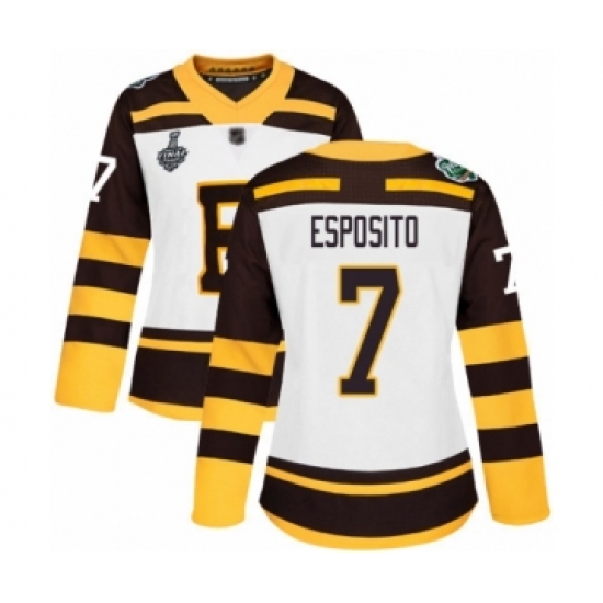 >Women's Boston Bruins #7 Phil Esposito Authentic White Winter Classic 2019 Stanley Cup Final Bound Hockey Jersey