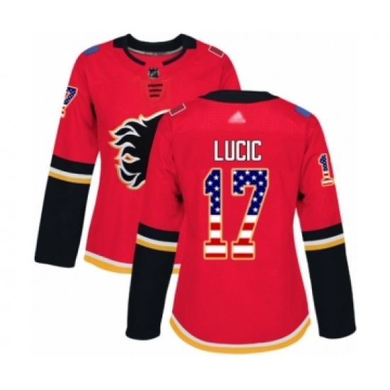>Women's Calgary Flames #17 Milan Lucic Authentic Red USA Flag Fashion Hockey Jersey