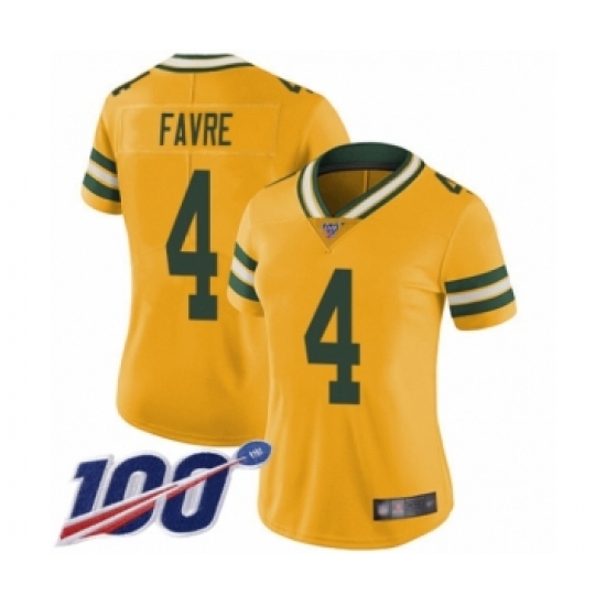 >Women's Green Bay Packers #4 Brett Favre Limited Gold Rush Vapor Untouchable 100th Season Football Jersey