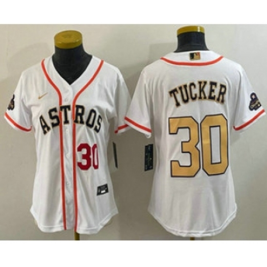 >Women's Houston Astros #30 Kyle Tucker Number 2023 White Gold World Serise Champions Cool Base Stitched Jersey1