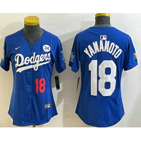 >Women's Los Angeles Dodgers #18 Yoshinobu Yamamoto Number Blue 2024 World Series With Fernando 34 Fashion Limited Stitched Jerseys