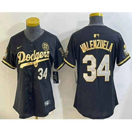 >Women's Los Angeles Dodgers #34 Fernando Valenzuela Black Gold 2024 World Series 34 Stitched Cool Base Jersey