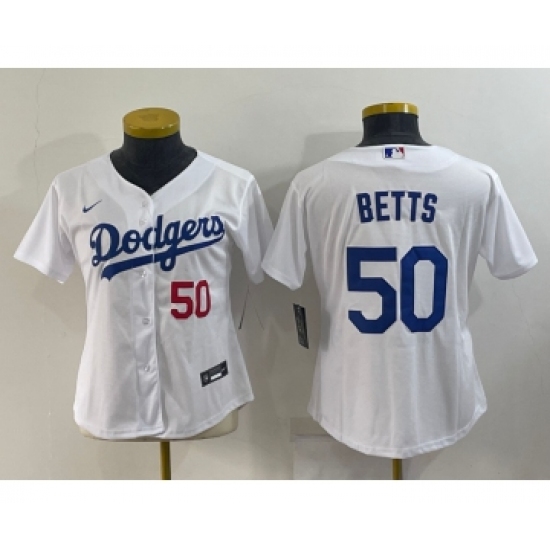 >Women's Los Angeles Dodgers #50 Mookie Betts White With Red Stitched MLB Cool Base Nike Jersey