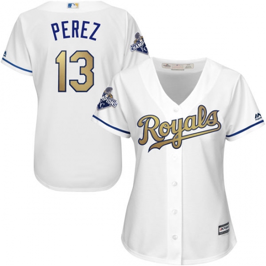 Home>MLB>Kansas City Royals>Salvador Perez>Women's Majestic Kansas City Royals #13 Salvador Perez Authentic White 2015 World Series Champions Gold Program Cool Base MLB Jersey