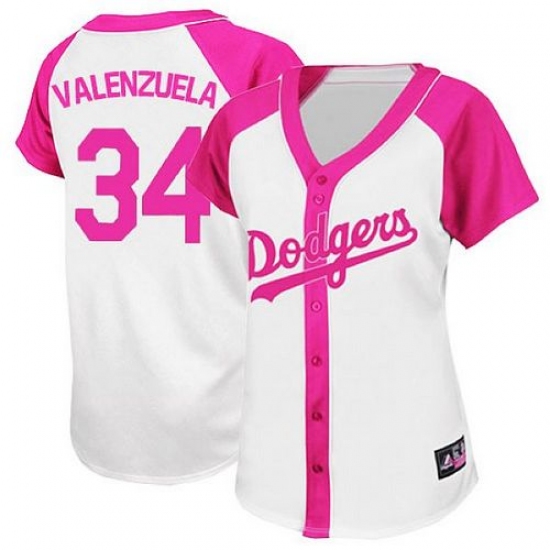 Women's Majestic Los Angeles Dodgers #34 Fernando Valenzuela Replica White/Pink Splash Fashion MLB Jersey