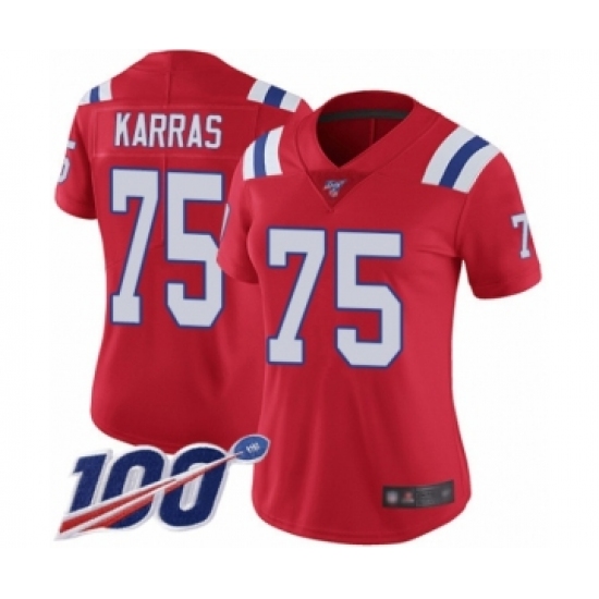 >Women's New England Patriots #75 Ted Karras Red Alternate Vapor Untouchable Limited Player 100th Season Football Jersey